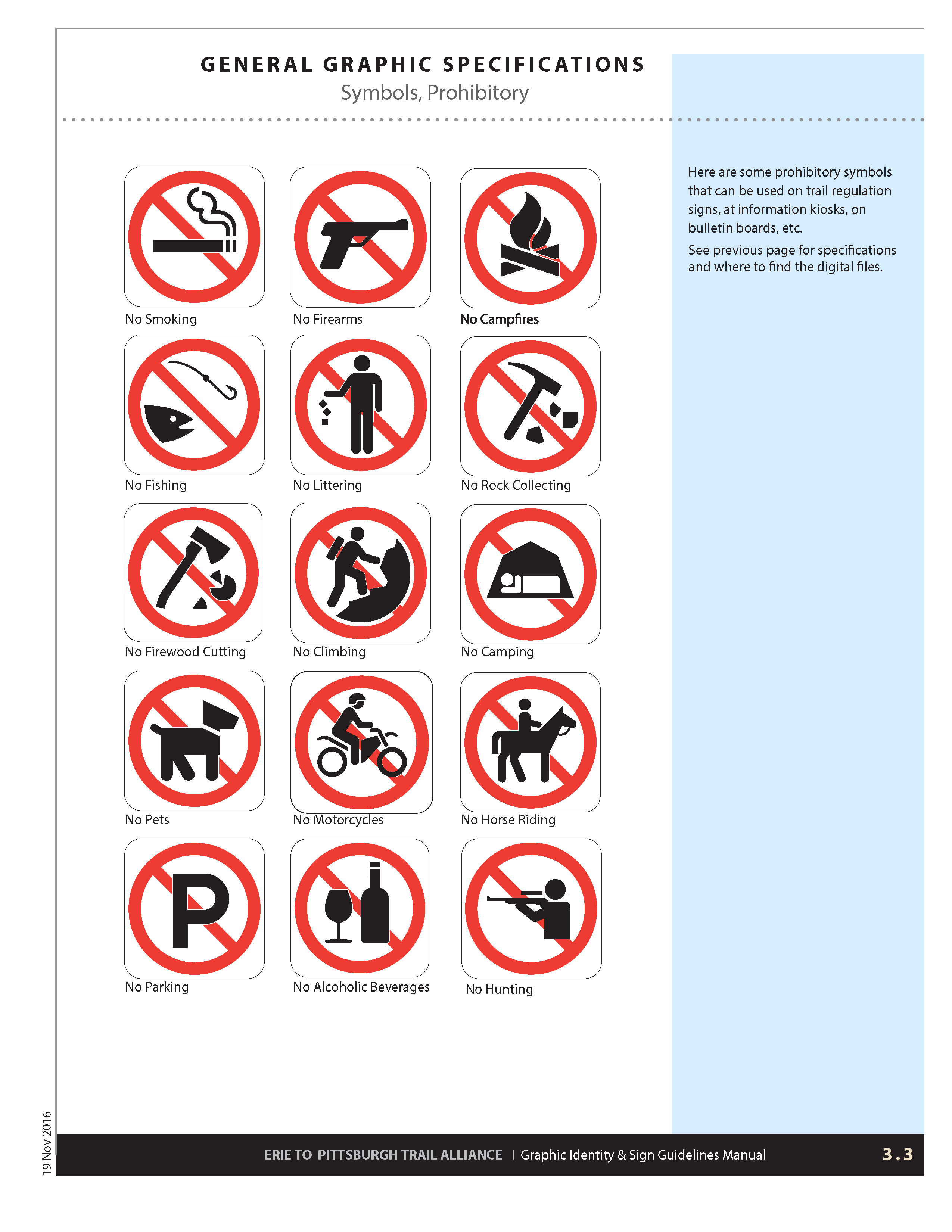3.3 Symbols, prohibitary [ prev ][ next ][ previous 3.2 Symbols, amenities and Services ][ next 3.4 Symbols, ADA ]Click image to see larger size.